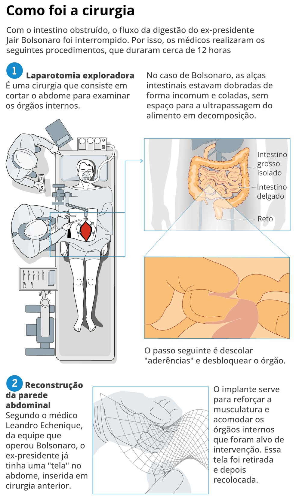 Bolsonaro passou por uma “laparotomia exploradora”,procedimento que consiste em cortar o abdome para examinar os órgãos internos. No caso do ex-presidente,houve o diagnóstico de retenção do trânsito do intestino. O objetivo,então,foi desfazer as “aderências” que bloquearam a digestão do paciente. Depois,houve a reconstrução da parede abdominal,feita para reforçar a musculatura dessa parte do corpo. O fim da cirurgia foi anunciado nas redes sociais pela ex-primeira-dama Michelle Bolsonaro,que informou que ela havia sido “concluída com sucesso” e agradeceu a seus seguidores pelo apoio e orações.