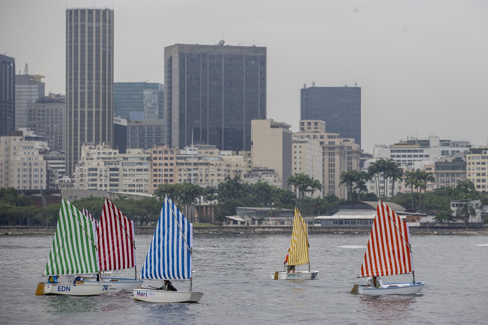 Regata-performance 'Voile/toile — Toile/voile',de Daniel Buren,na Baía da Guanabara; peças agora estão no MAM — Foto: Guito Moreto