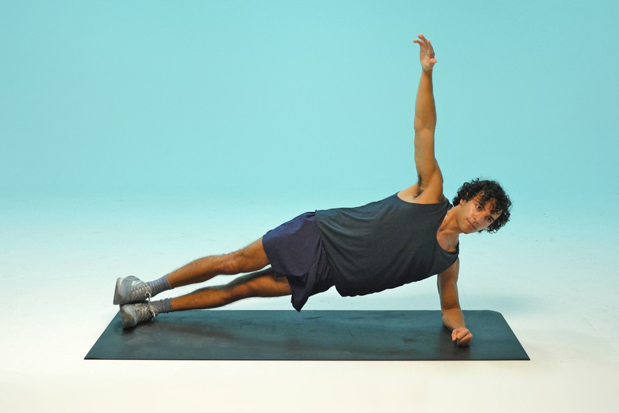Deite-se de lado com o cotovelo alinhado ao ombro. Levante os quadris para formar uma linha reta da cabeça aos pés. Mantenha os ombros alinhados e os glúteos contraídos enquanto segura a posição e estenda o braço de cima em direção ao teto. Em seguida,abaixe o corpo de forma controlada.