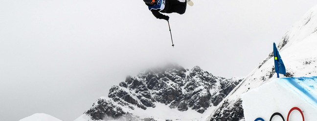 O finlandês Elias Syrja participa de um treino de slopestyle de esqui estilo livre masculino durante os Jogos Olímpicos de Inverno de Milão-Cortina 2026 no Livigno Snow Park,em Livigno (Valtellina),em 6 de fevereiro de 2026. — Foto: Jeff PACHOUD / AFP