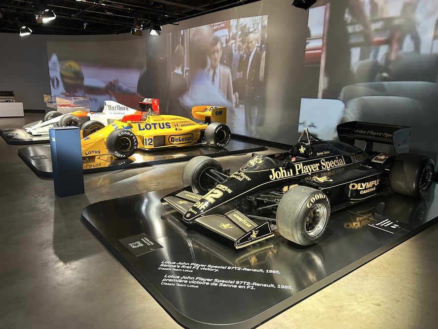 Os visitantes podem admirar duas das três Lotus que Senna guiou na F1. O modelo 97T,equipado com motor Renault,ajudou o brasileiro a conquistar sua primeira vitória na categoria,no GP de Portugal de 1985. As cores preta e dourada atraem olhares de todos que passam por ali.