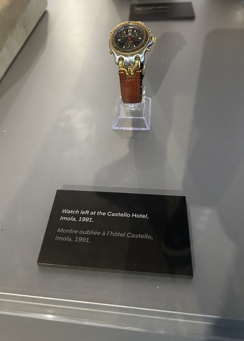 Este relógio foi deixado para trás por Ayrton em 1991 no Hotel Castello,localizado em Castel San Pietro Terme,que era o local onde o brasileiro costumava ficar hospedado nas semanas do Grande Prêmio de San Marino,que nos últimos anos mudou de nome para GP da Emília Romagna.