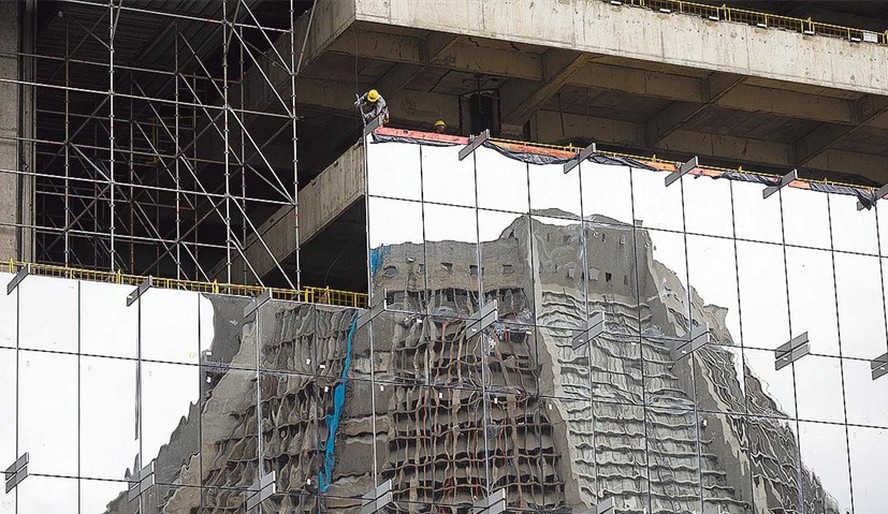 Vidros espelhados são colocados na fachada do Edifício Sede da Petrobras — Foto: Márcia Foletto