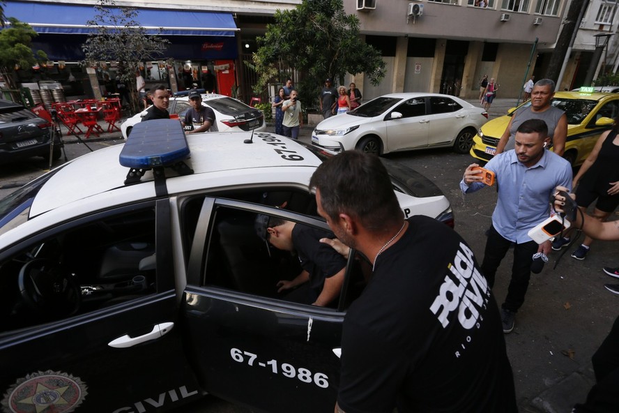Policial conduz um dos suspeitos de estupro coletivo em Copacabana — Foto: Marcelo Theobald / Agência O Globo/ 03/03/2026